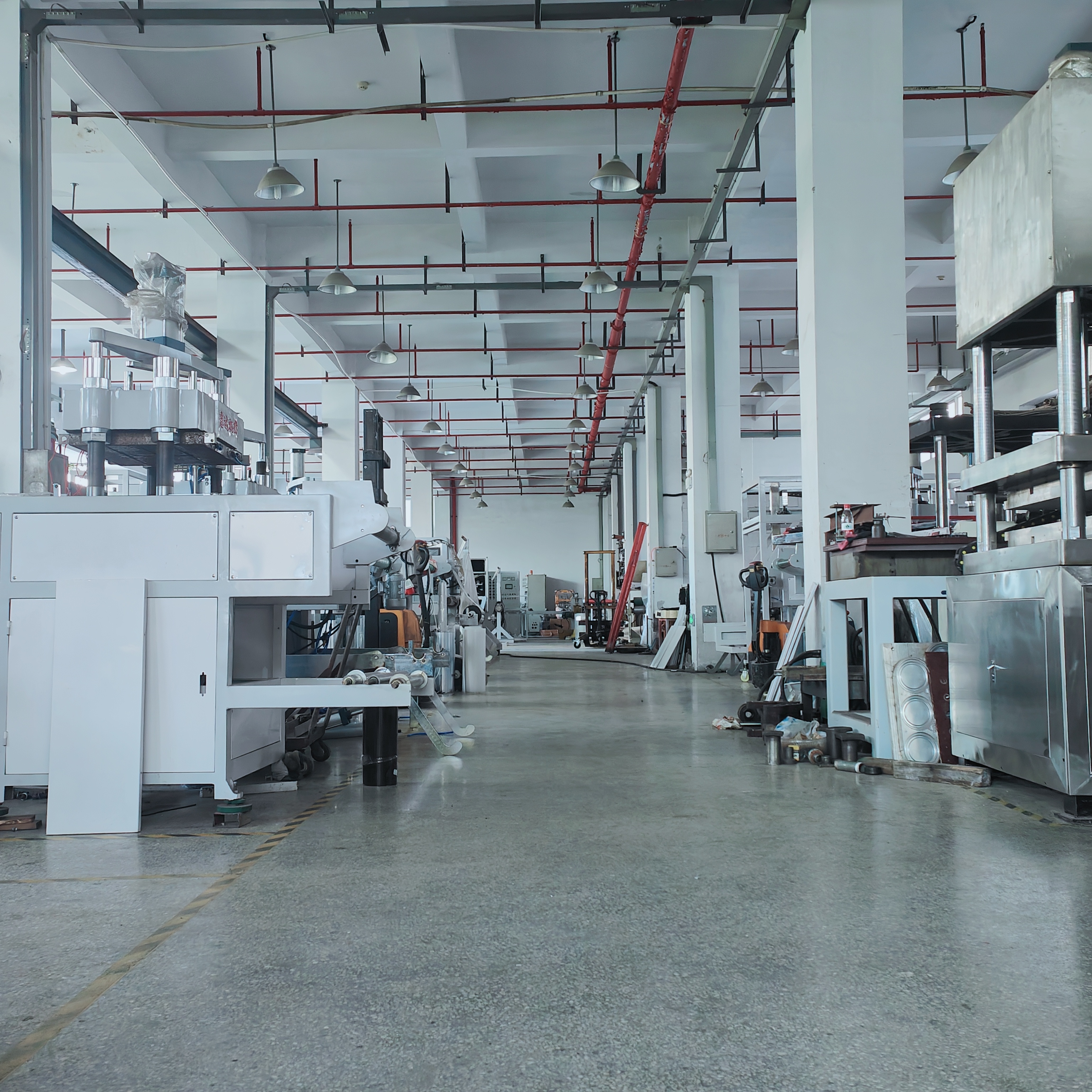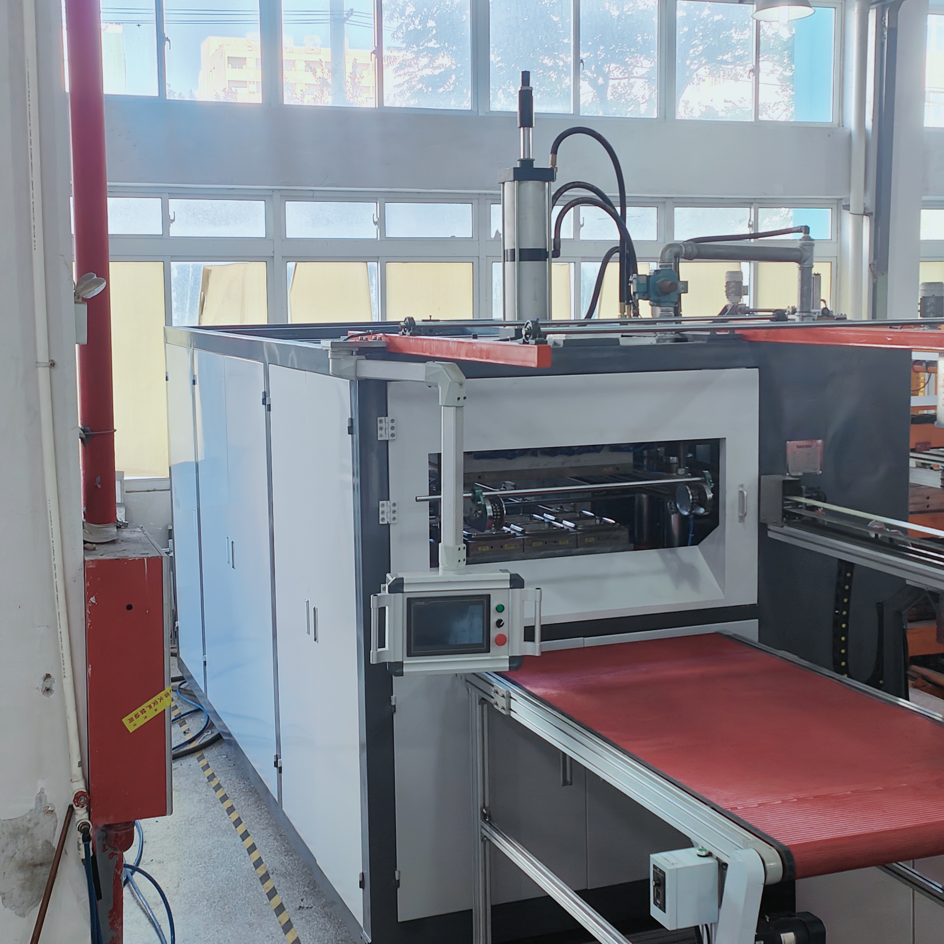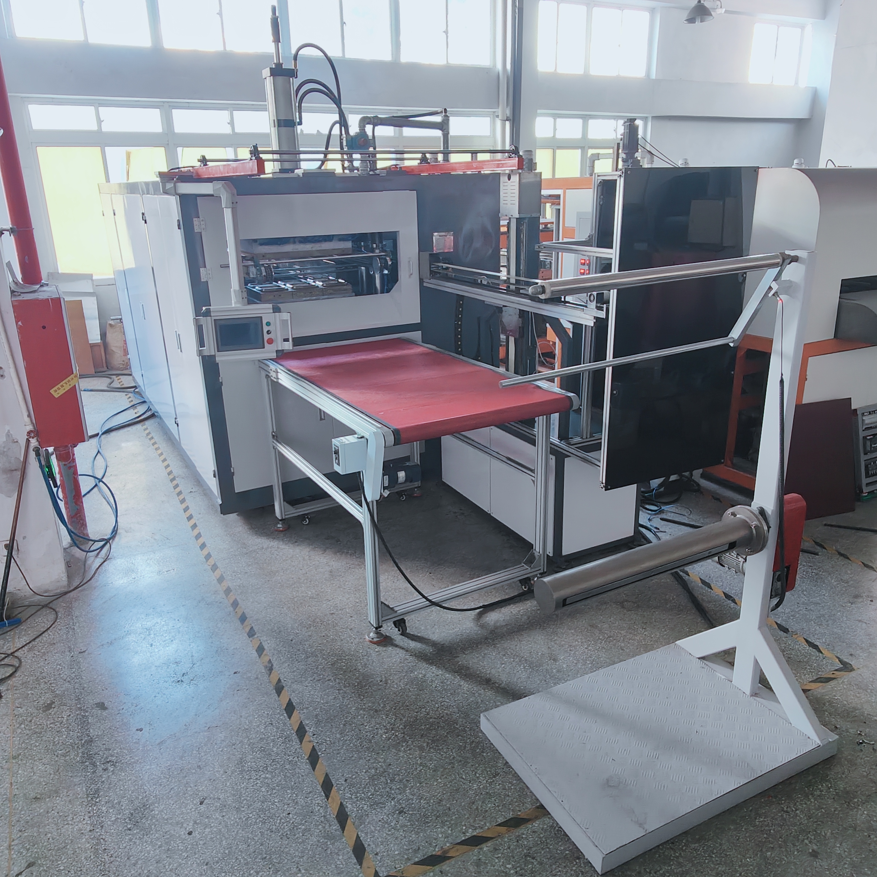6、整机结构紧凑,把放料、加热、成型、剪切、冷却、成品堆叠、成品输送、废料收卷等功能集于一机,使产品流程短,成品档次高,符合国家卫生标准。